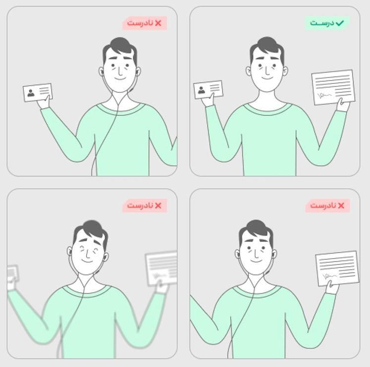 کارت ملی (یا سایر مدارک قابل قبول) خود را به گونهای در دست بگیرید که مشخصات آنها کاملا خوانا باشد و هردو دست در تصویر دیده شوند.