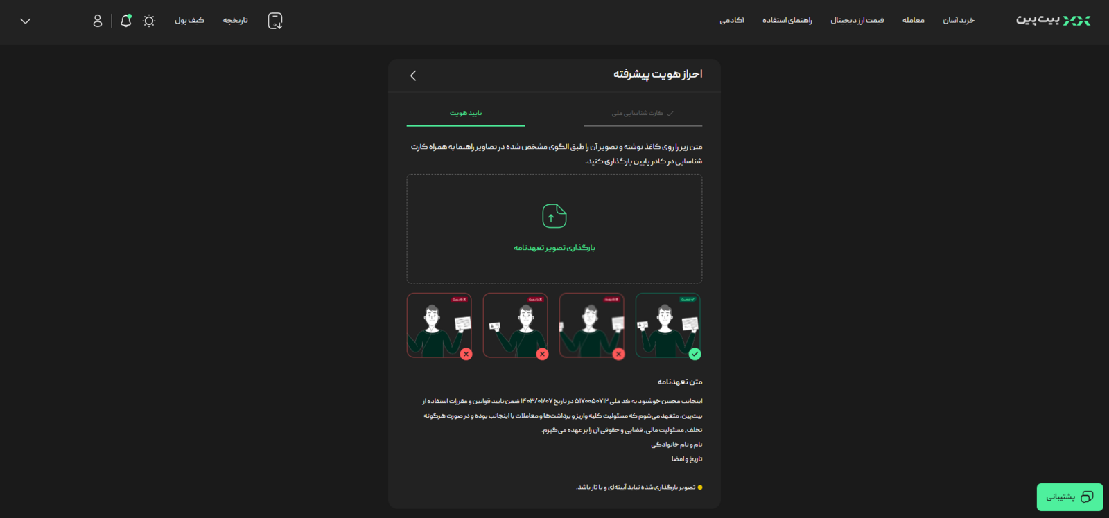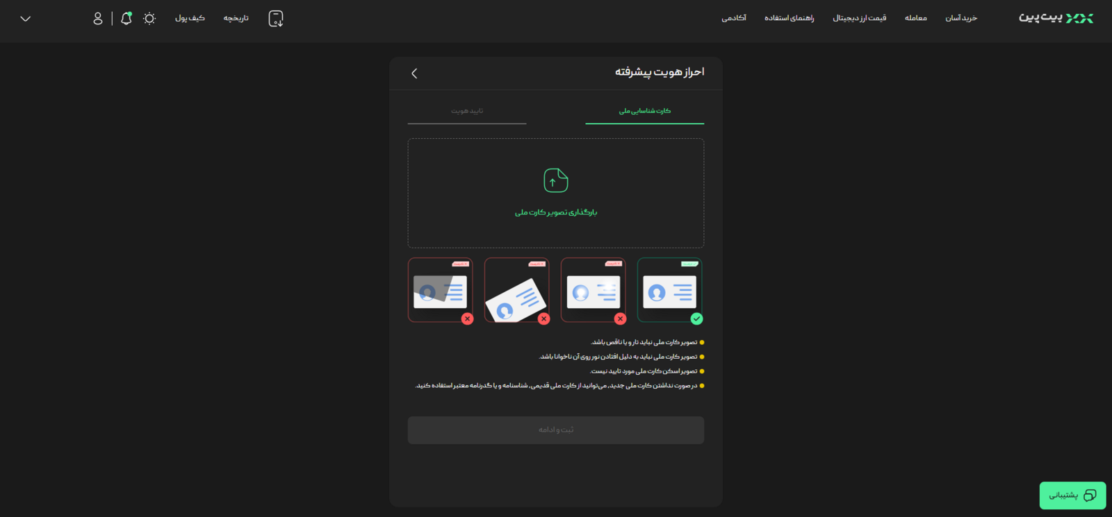 برای ارتقا به سطح کاربری پیشرفته در بیتپین، ابتدا باید تصویر کارت ملی خود را با شرایط زیر بارگذاری کنید: