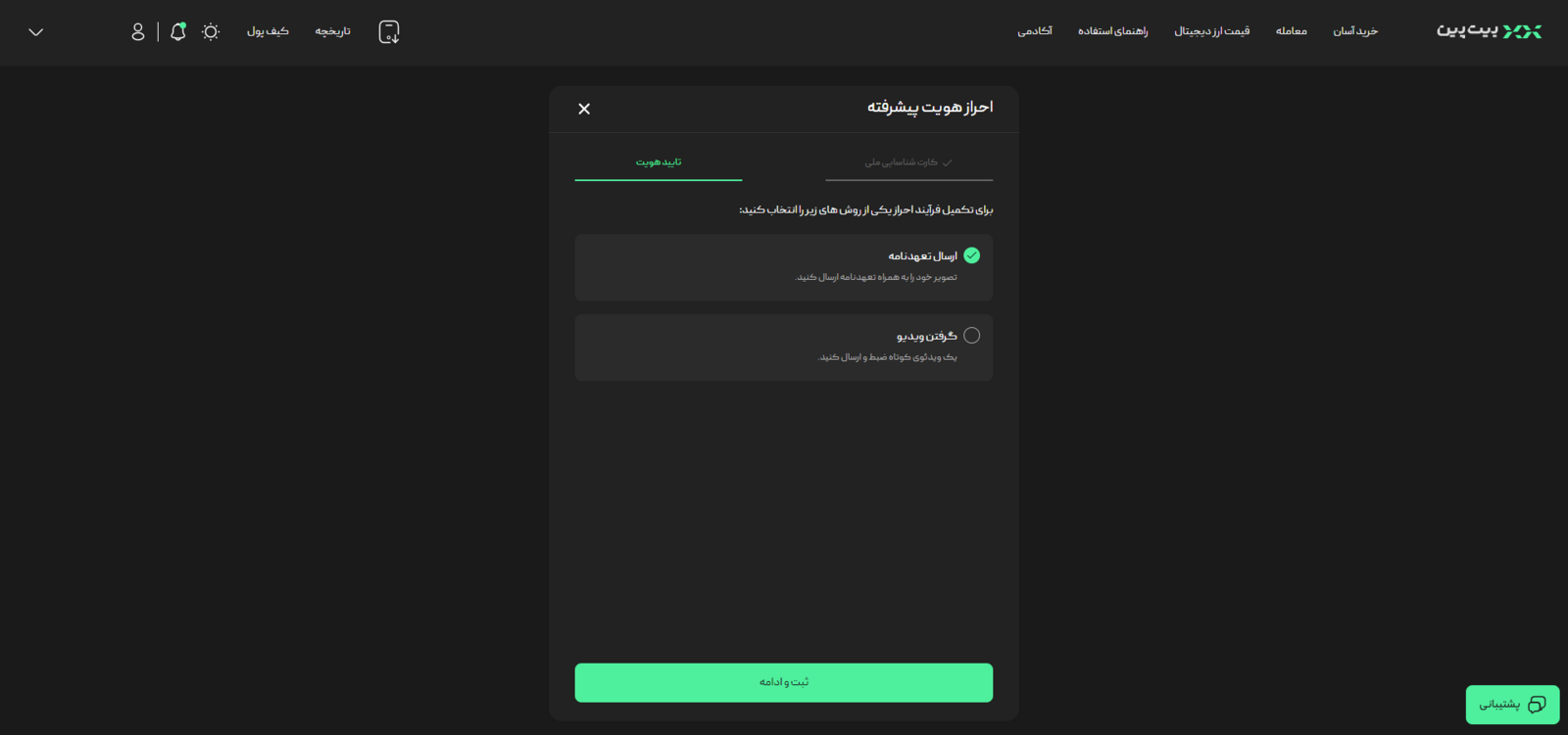 پس از آپلود تصویر کارت ملی، میتوانید از طریق ارسال تصویر تعهدنامه یا ارسال ویدیو، طبق الگوی ارائه شده در این راهنما، احراز هویت پیشرفته خود را کامل کنید.